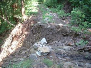 少し前の状況ですが(6月12日)、復旧は当分無理だと思います。但馬トンネル横(村岡側)から4キロ地点で、写真のように崩落しています。道中も深い溝が掘れており、ヤジロベエのようなバランスが必要です。http://blog.goo.ne.jp/forestclub/