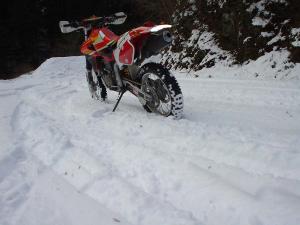 おめでとうございます。初走りで4日に大名栗林道目指して有間林道側から入りましたが、ご覧のとおりの雪で650ではスパイク無しではかきむしるだけでだんだん前には進まなくなり撤退。ま~ソロだったのでこんなもんですね。私のチャレンジ中にもマウンテンバイクのチャレンジャー達が4人ほど来てましたが彼らも撤退してました。スパイクならば結構楽しめるかもしれません?